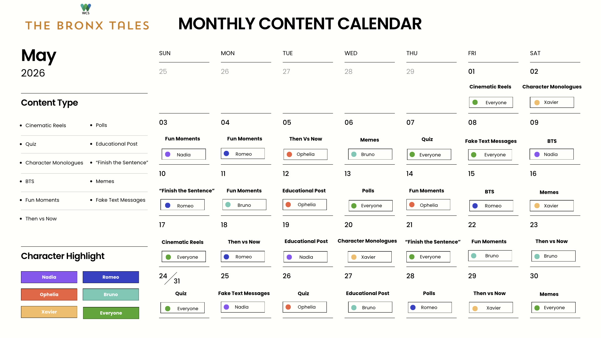 Posted on Instagram, TikTok, X, and Facebook daily.
