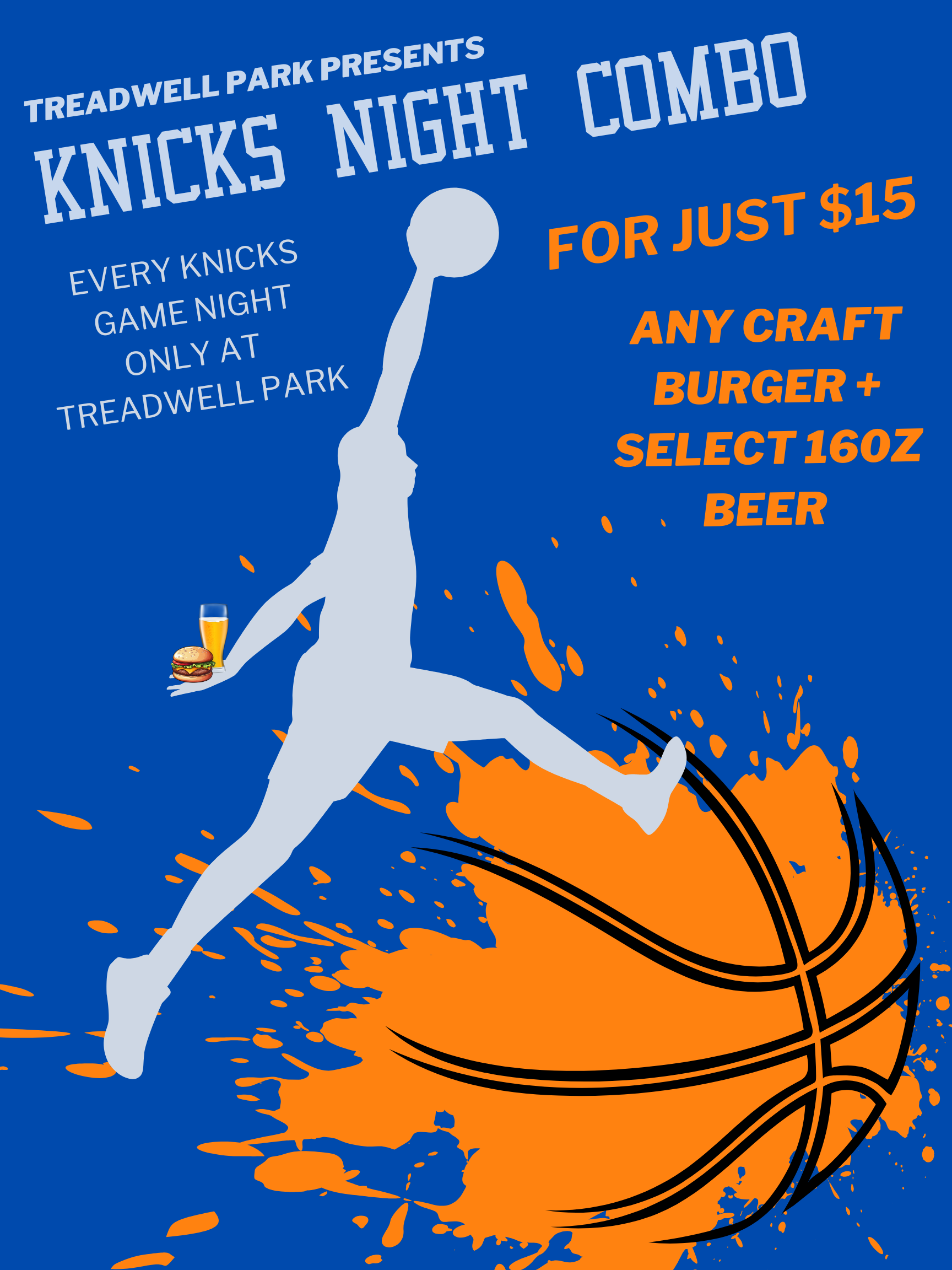 Knicks Night Combo turns game nights into a must-visit event, offering a $15 burger and beer deal. Fans can enjoy the game on big screens, participate in halftime raffles, and show team spirit by wearing Knicks gear. Using posters around the bar and nearby streets helps attract both regular patrons and new visitors, promoting the deal visually and creating excitement for game nights.
